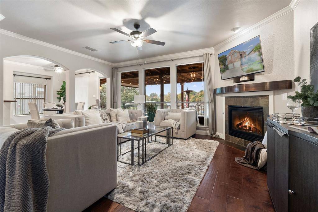 Welcome to waterfront living on Eagle Mountain Lake—where every day feels like a getaway. Tucked inside the gated section of Lake Country Estates, this 4-bedroom home delivers unbeatable views, effortless indoor–outdoor flow, and direct access to the water with your own two-story dock and lift. The main living room is warm and welcoming, featuring a gas log fireplace and with lots of windows framing the lake. Upstairs, you'll find a versatile loft space—perfect for an office, game room, or second lounge area without overstating its size. The kitchen offers an island, breakfast bar, and a window-lined breakfast nook overlooking the water. There is also a formal dining room for entertaining because your home is about to become everyone's favorite place! Step outside and you'll understand why this home is unforgettable. The covered patio offers plenty of room for dining and lounging, plus a full outdoor kitchen with grill and hood, beverage fridge, and a bar complete with its own beer tap—built for hosting. There's even a built in projector mount to bring your favorite movies outside, or host Sunday Football. The two-story dock with boat lift makes getting on the water easy, and the HOA-provided front and backyard lawn service keeps maintenance simple. Additional highlights include hardwood floors, two AC units, a newer metal roof, and updated Low-E windows for improved energy efficiency. This is your chance to own a true lakeside retreat. Schedule your private showing and experience the Eagle Mountain lifestyle firsthand.