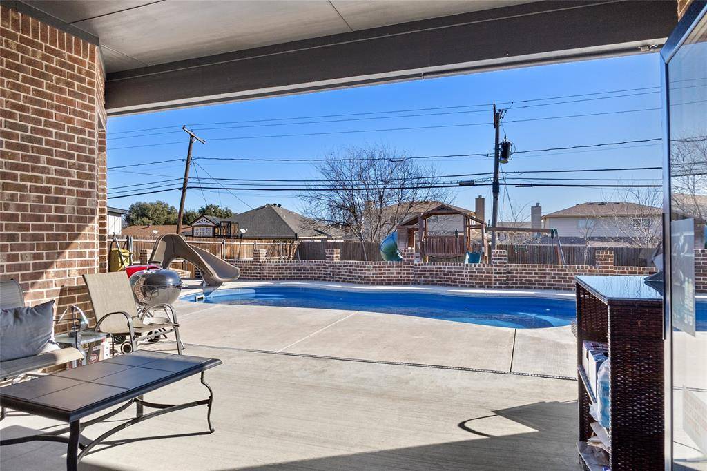 This nearly new, all brick, home immediately stands out with a backyard that truly sets it apart! The saltwater pool and oversized patio create a complete outdoor retreat, already finished and ready to enjoy! Inside, the single-story open floorplan offers solid surface flooring throughout the main living areas. You are greeted upon entering the home by a large living room complete with surround sound and wood burning fireplace. The kitchen features a large granite island with room for extra seating, stainless steel appliances, pot filler, double oven, and an oversized eat-in area that comfortably doubles as formal dining, making entertaining effortless.The private primary suite is thoughtfully separated from the secondary bedrooms, providing flexibility and privacy. The primary bath includes a double vanity with separate soaking tub, walk-in shower, and large walk-in closet. This home has 4 bedrooms and 2 full bathrooms with one bedroom easily used as a home office, or additional play or game room. The full sized utility room has lots of storage and additional appliance or refrigerator space. Again, the saltwater pool and oversized patio and entertaining area are a perfect retreat for those hot Texas days. Totally relax because you have a full wood privacy fence around the entire backyard. Beyond the pool area there is still a huge green space for playing, gardening, or whatever you can imagine! To complete the package, the location offers exceptional convenience for commuting. It's Less than 10 minutes to the Naval Air Station Joint Reserve Base Fort Worth and Tarrant County College. Under 20 minutes to BNSF Railway headquarters, major Fort Worth hospitals, and downtown Fort Worth. This home delivers a rare combination of outdoor lifestyle and everyday accessibility that is hard to find!