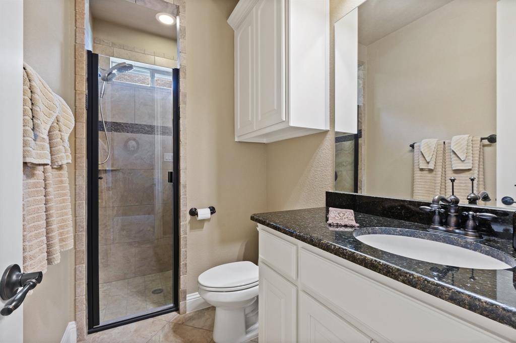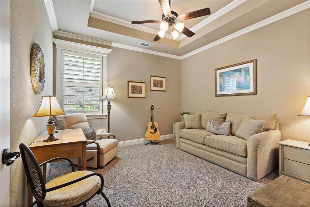 The chef's kitchen boasts stainless steel appliances, granite countertops, a pot filler, and a striking stone and brick breakfast bar — perfect for entertaining. A private study with built-in shelving offers a quiet retreat for work or reading.