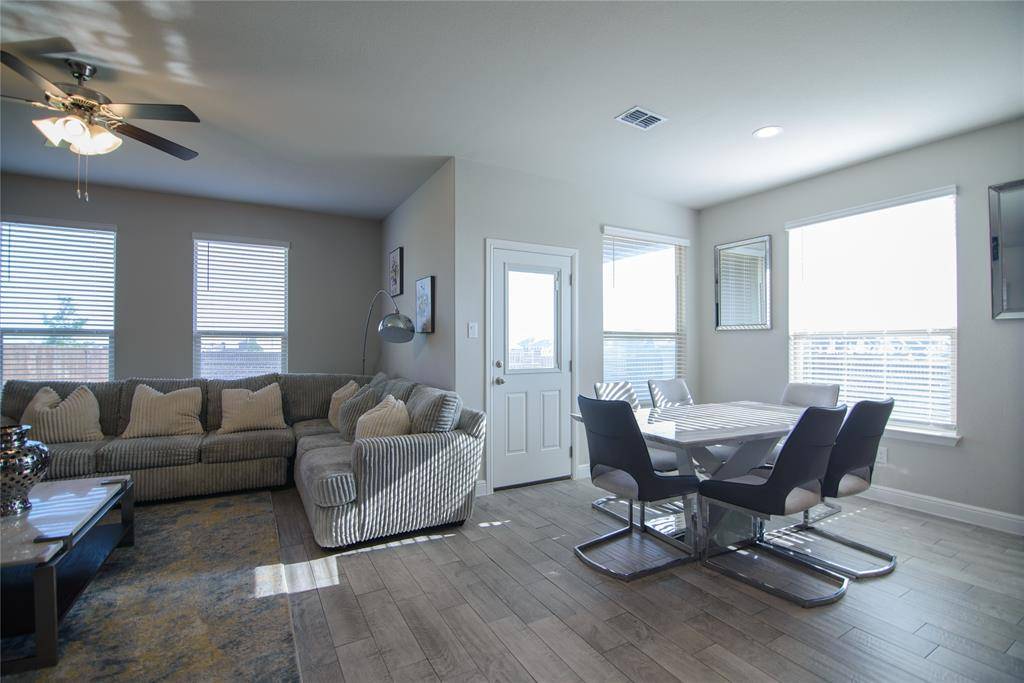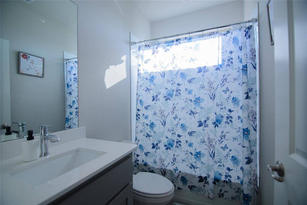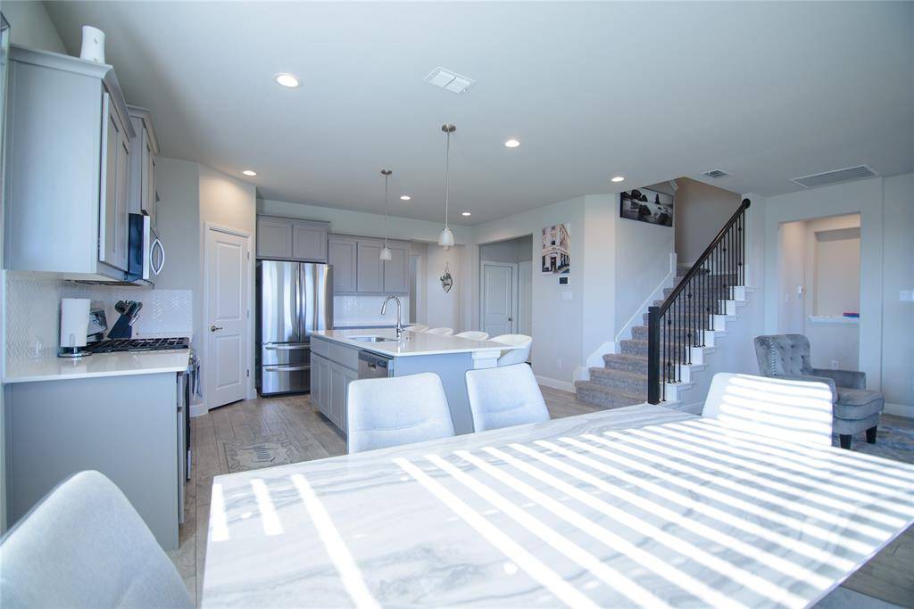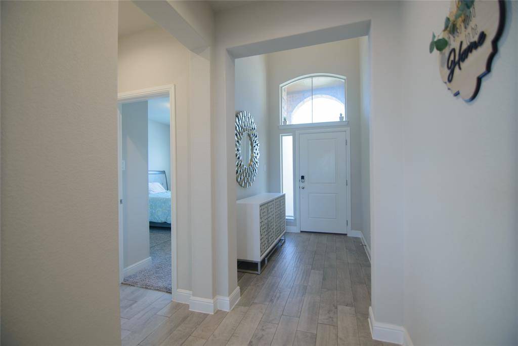 Located in highly sought-after Northwest ISD, this beautifully designed two-story home offers over 2,800 square feet with 5 bedrooms and 4 full bathrooms on an oversized lot. There is BRAND NEW CARPET and FRESH PAINT. The open-concept floor plan features a spacious living area that flows seamlessly into the chef's kitchen with a large island, quartz countertops, tiled backsplash, stainless steel appliances, gas range, and walk-in pantry—perfect for everyday living and entertaining. The main level includes a generously sized primary suite with dual-sink quartz vanity, garden tub, oversized shower, and walk-in closet, plus an additional bedroom and full bath ideal for multigenerational living or a home office. Upstairs you'll find three more bedrooms, two full bathrooms with quartz vanities, and an enormous game room that can accommodate multiple living, work, or play spaces. Step outside to enjoy the covered patio overlooking the fully fenced backyard. Additional features include a tankless water heater, full sprinkler system, and access to community pool. Conveniently located near shopping, dining, entertainment, and with easy access to HWY 287 and I-35W.