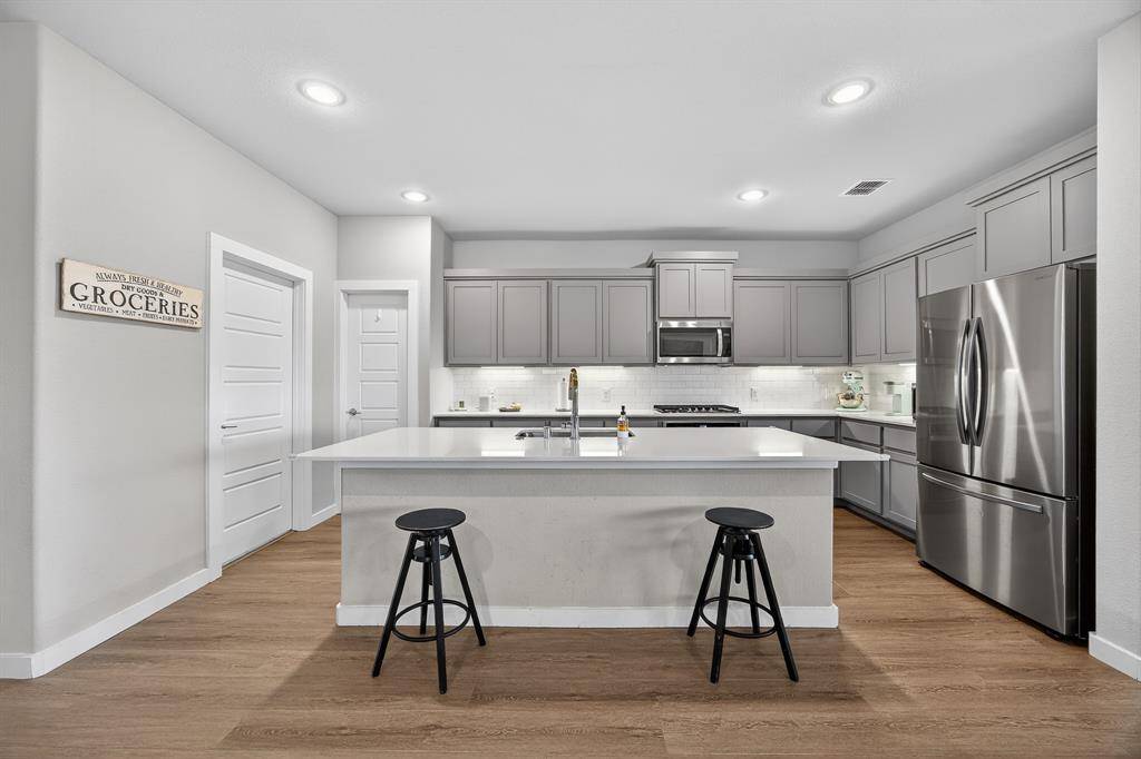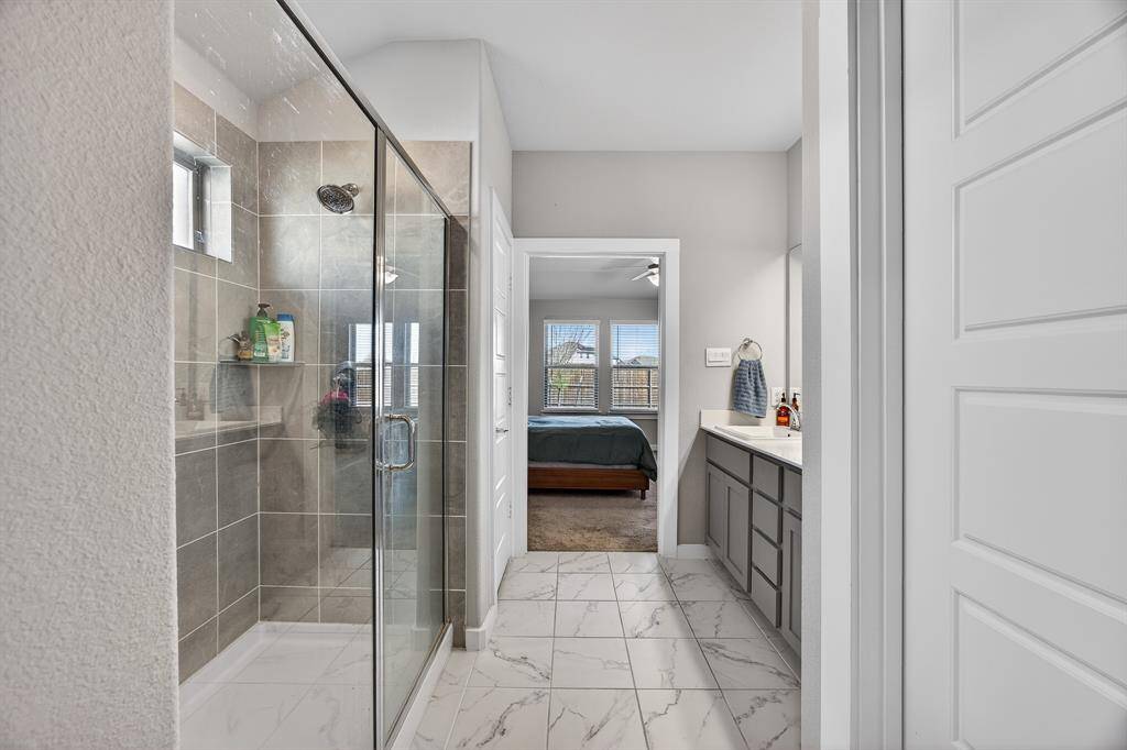 The spacious primary suite features a stylish barn-style sliding door leading into the bathroom, adding a touch of modern farmhouse character. The home is also wired for security cameras, offering convenience for a modern security setup.