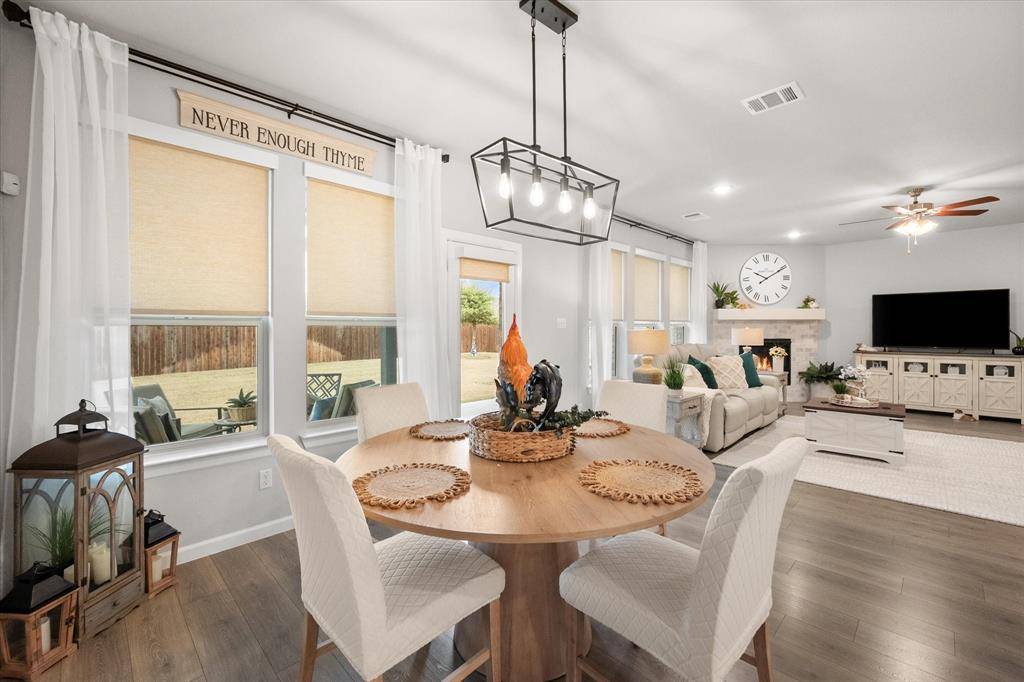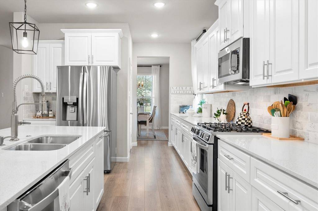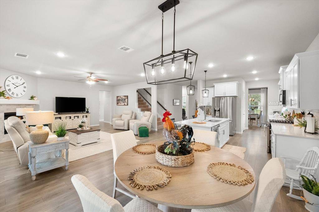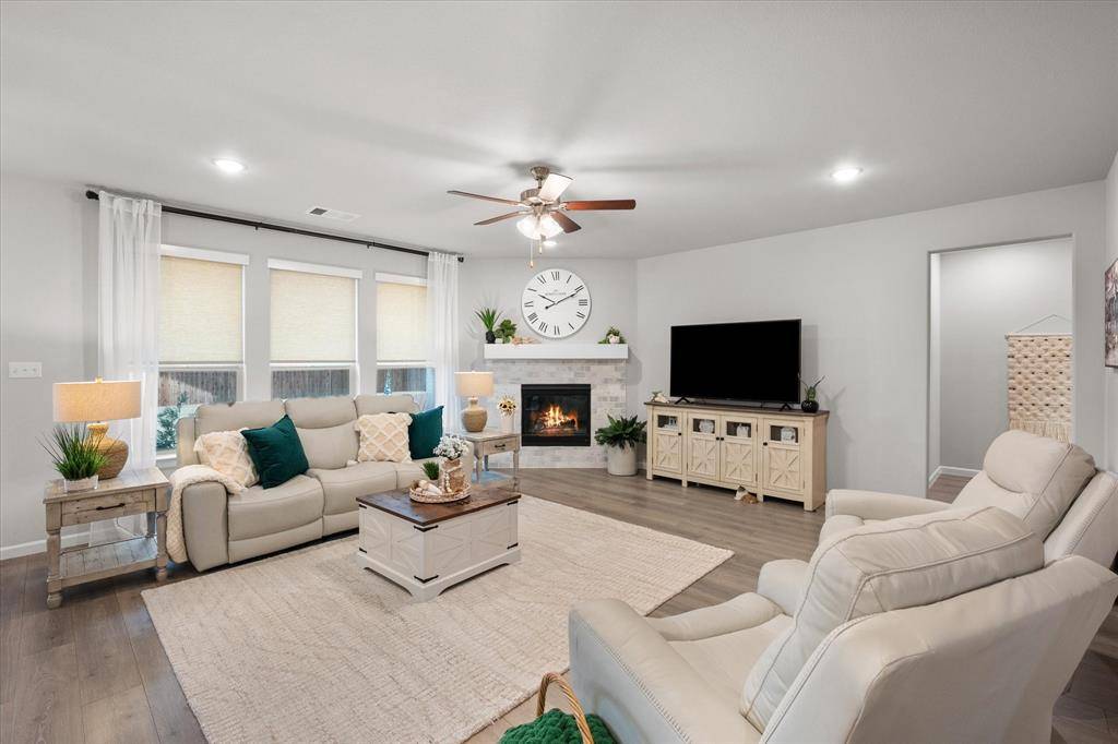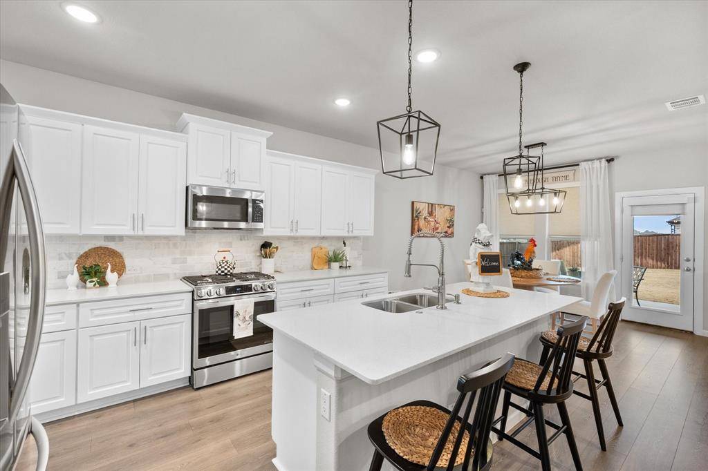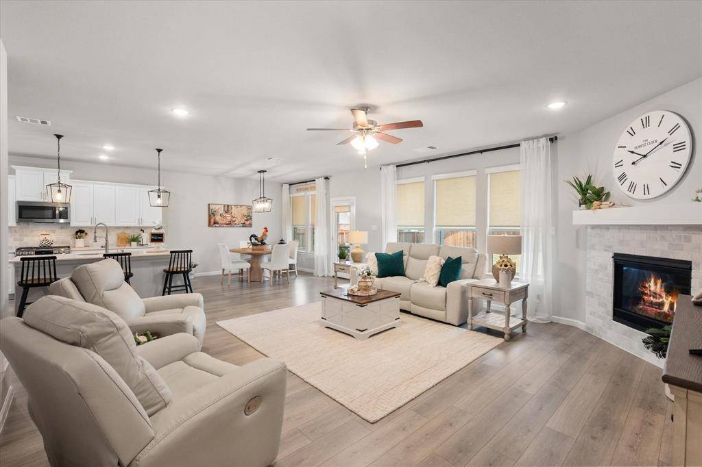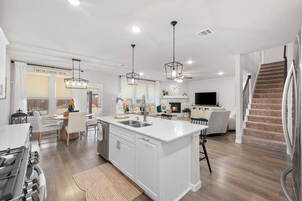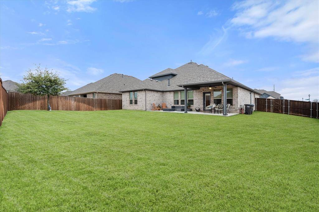 Situated on a desirable corner lot in the welcoming Wellington community, this beautifully designed home offers over 3,000 sq. ft. of thoughtfully crafted living space—perfect for both everyday living and entertaining. Located within the award-winning Northwest ISD, this 4-bedroom, 3-bath residence blends style, comfort, and functionality. Step inside to find luxury vinyl plank flooring throughout the main living areas, complemented by plush carpeting in the bedrooms and game room. The open-concept layout features a spacious living room anchored by a sleek gas fireplace, seamlessly connecting to the chef's kitchen. Enjoy a large quartz island, 5-burner gas cooktop, stainless steel appliances, abundant cabinetry, and a walk-in pantry, ideal for both cooking and gathering. A separate dining room offers flexible use as a home office or formal space. The private primary suite features an oversized shower with a built-in bench, a spacious en-suite bath, and a large walk-in closet. A secondary bedroom and full bath are conveniently located on the main level for guests. Upstairs, a versatile game room provides the perfect second living area, along with two additional bedrooms, walk-in closets, and a full bath with easy attic access. The backyard is designed for relaxation and entertaining, featuring a covered patio extended by an open patio, perfect for outdoor dining and gatherings. The pool-sized yard is fully enclosed with a board-on-board privacy fence.
