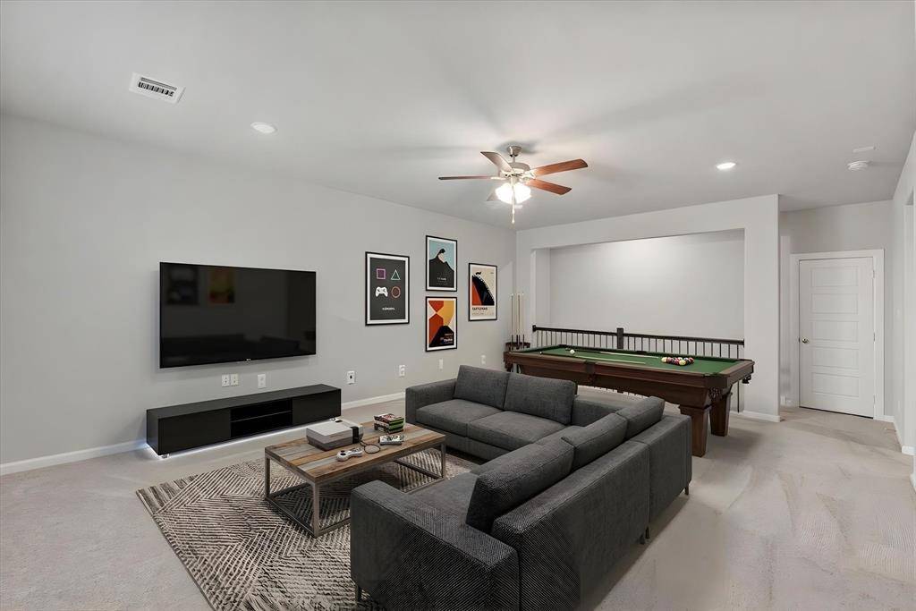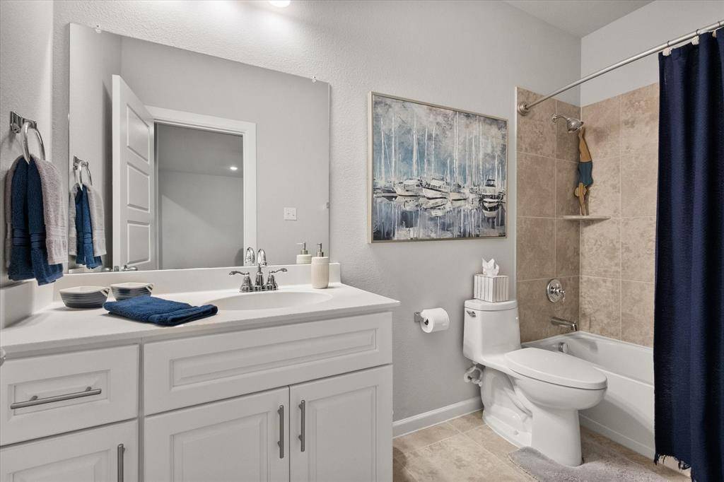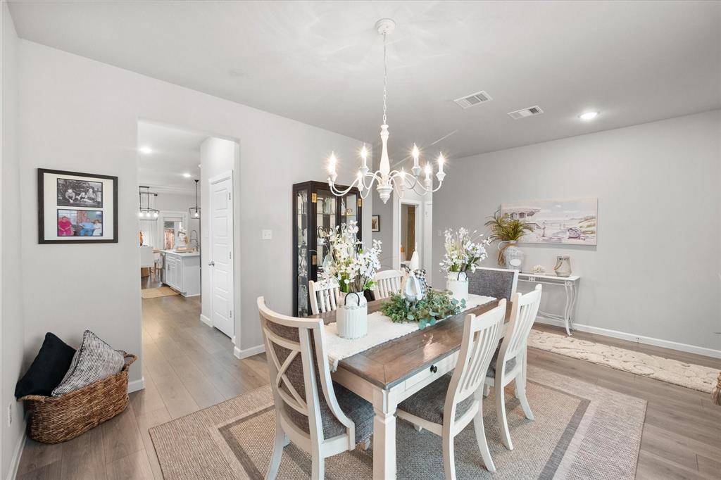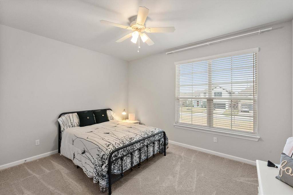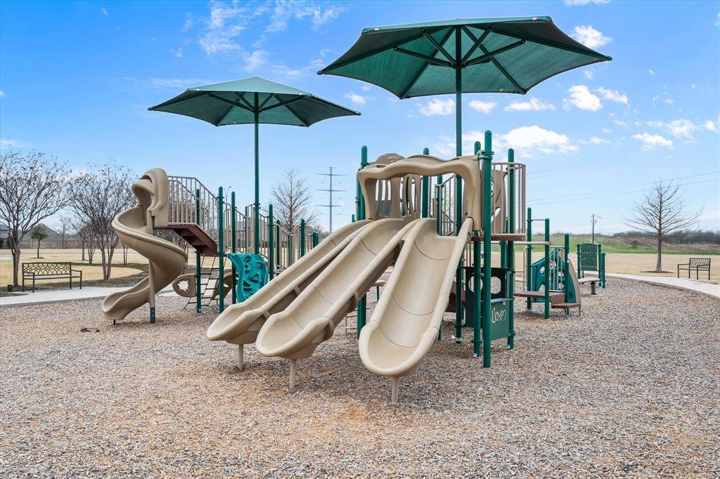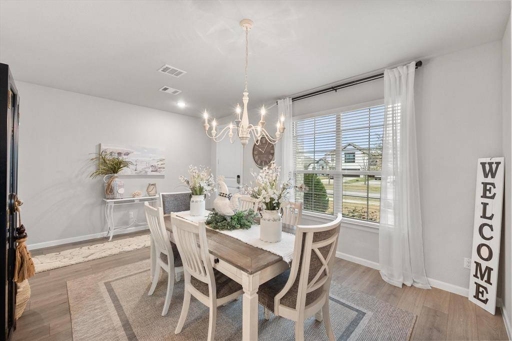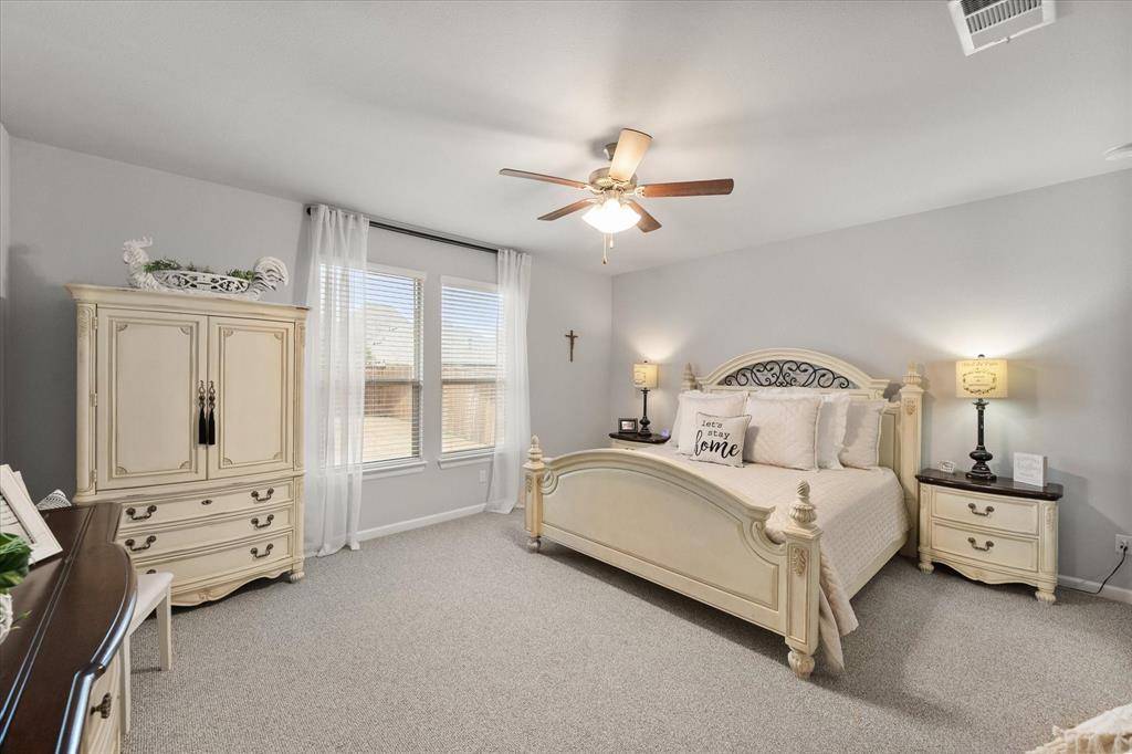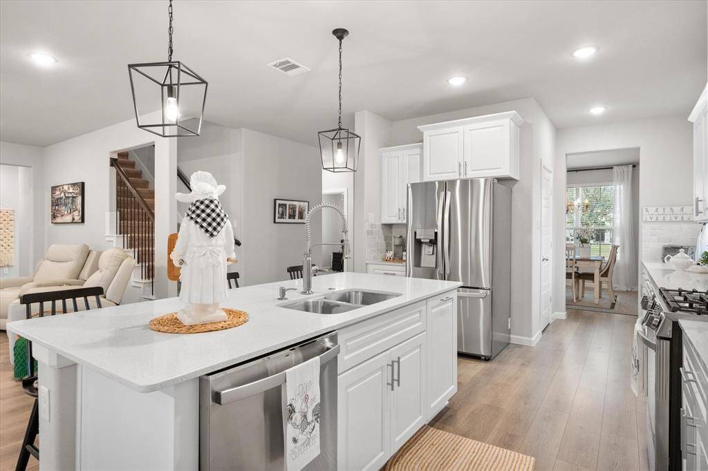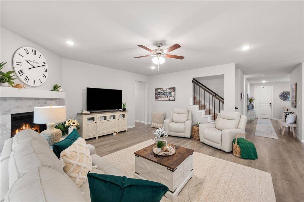 Situated on a desirable corner lot in the welcoming Wellington community, this beautifully designed home offers over 3,000 sq. ft. of thoughtfully crafted living space—perfect for both everyday living and entertaining. Located within the award-winning Northwest ISD, this 4-bedroom, 3-bath residence blends style, comfort, and functionality. Step inside to find luxury vinyl plank flooring throughout the main living areas, complemented by plush carpeting in the bedrooms and game room. The open-concept layout features a spacious living room anchored by a sleek gas fireplace, seamlessly connecting to the chef's kitchen. Enjoy a large quartz island, 5-burner gas cooktop, stainless steel appliances, abundant cabinetry, and a walk-in pantry, ideal for both cooking and gathering. A separate dining room offers flexible use as a home office or formal space. The private primary suite features an oversized shower with a built-in bench, a spacious en-suite bath, and a large walk-in closet. A secondary bedroom and full bath are conveniently located on the main level for guests. Upstairs, a versatile game room provides the perfect second living area, along with two additional bedrooms, walk-in closets, and a full bath with easy attic access. The backyard is designed for relaxation and entertaining, featuring a covered patio extended by an open patio, perfect for outdoor dining and gatherings. The pool-sized yard is fully enclosed with a board-on-board privacy fence.