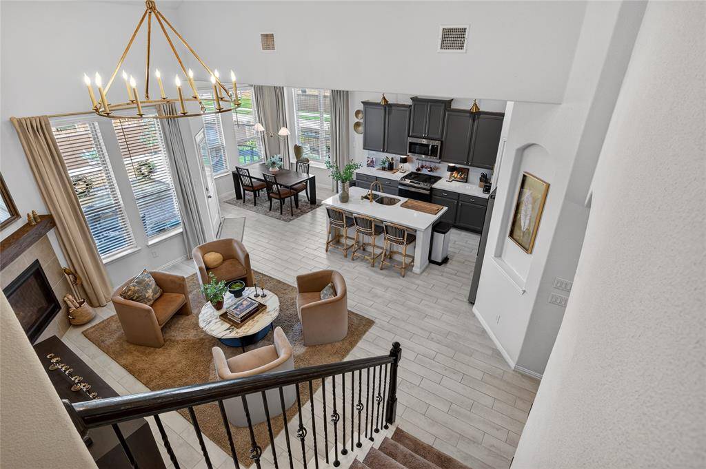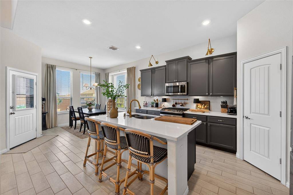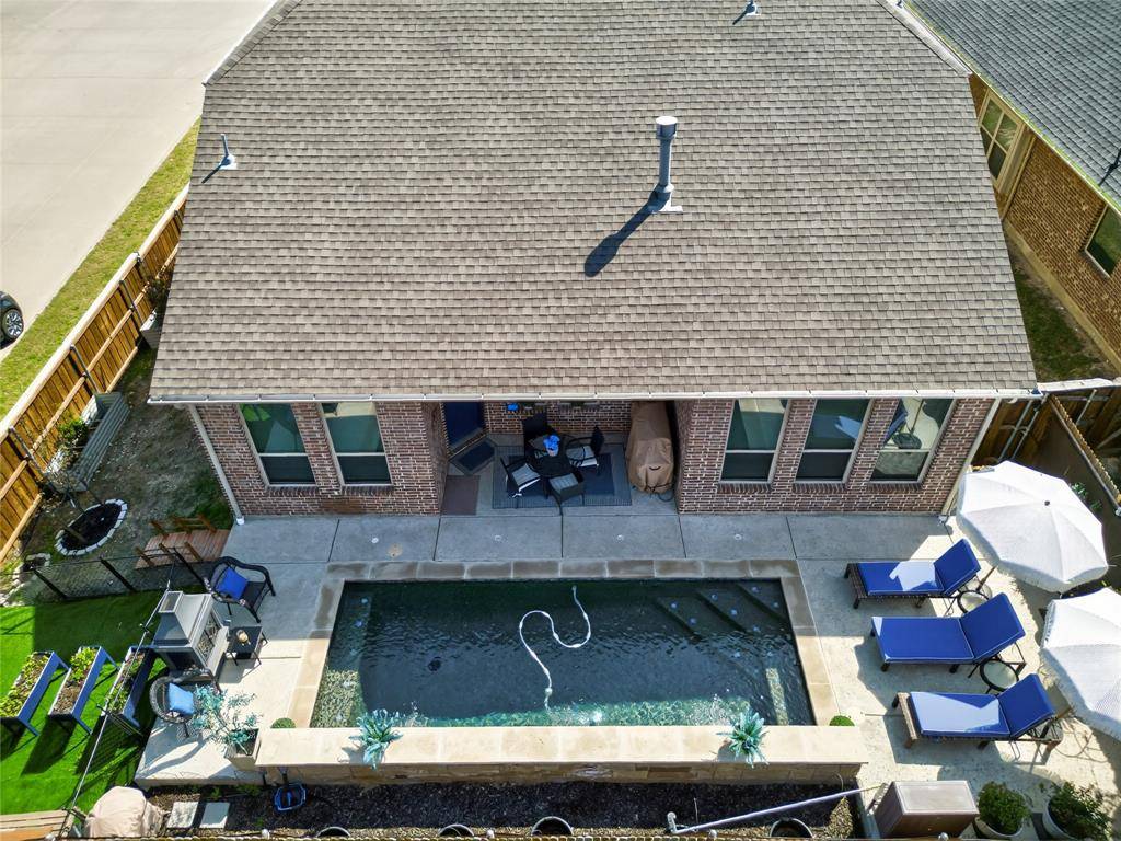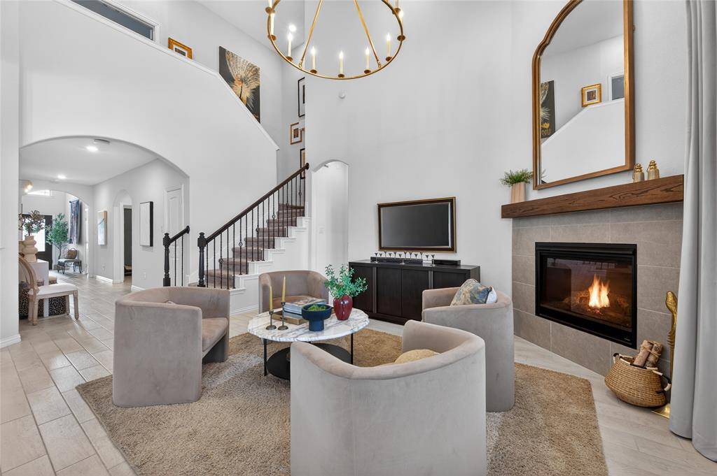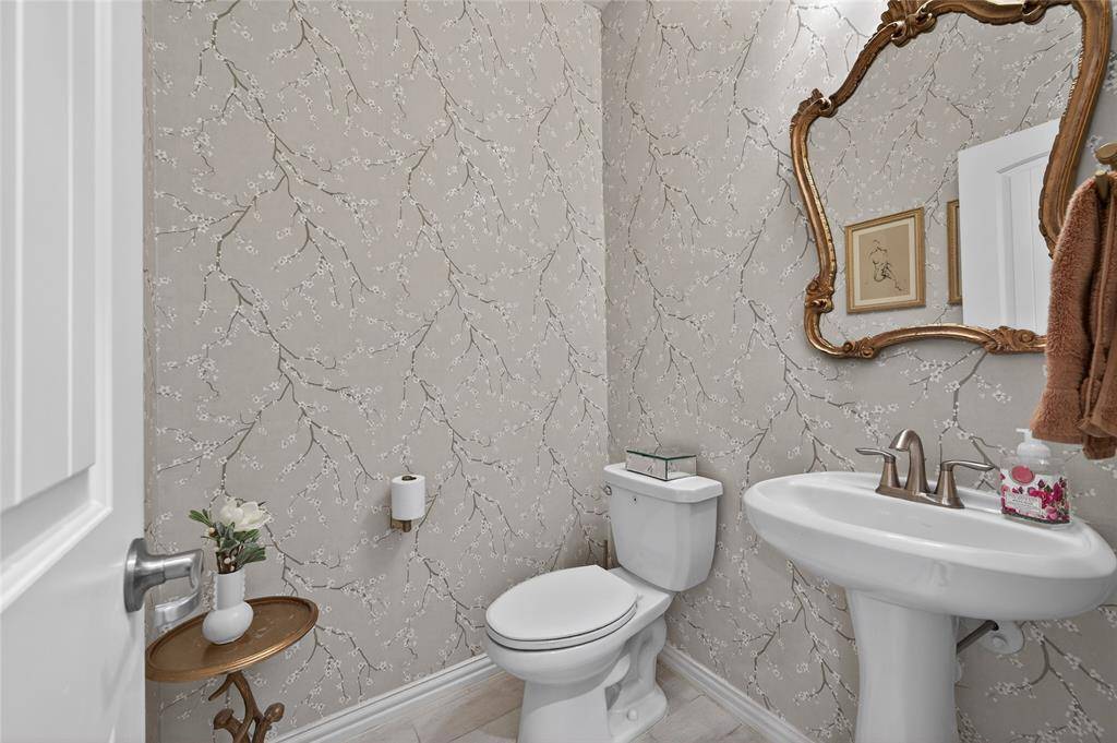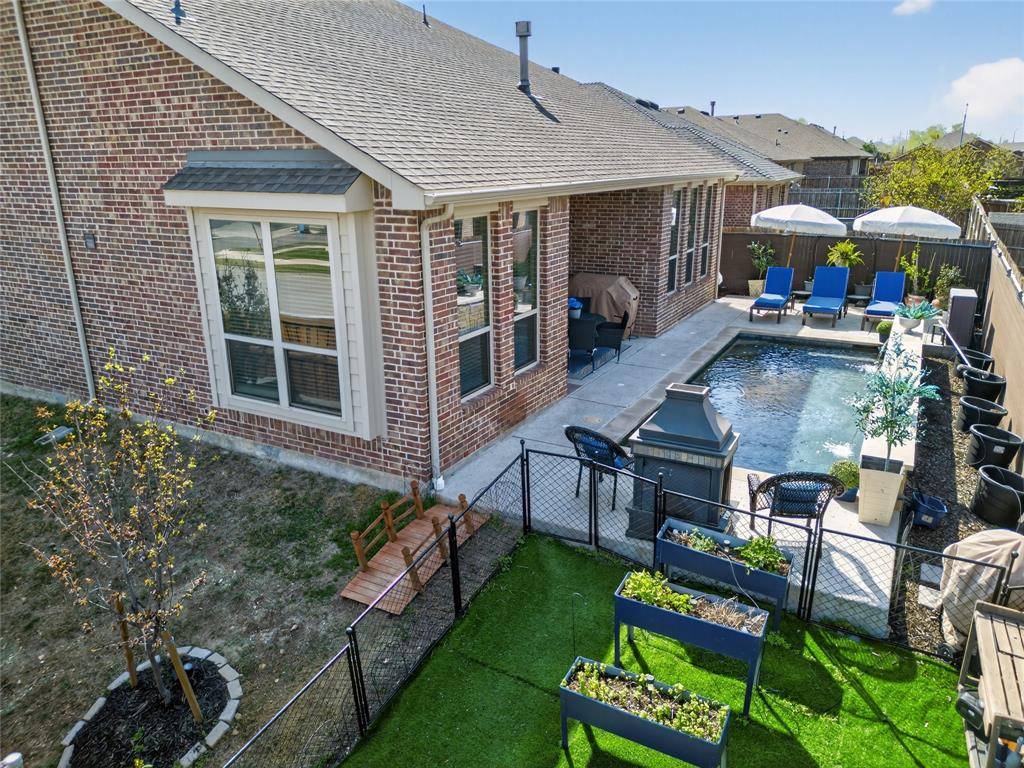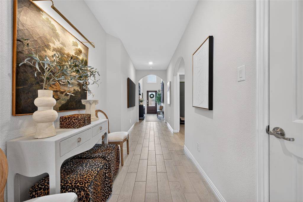 Set in Copper Crk, this 4-bedroom, 3 full bath, 1 half bath home offers 3,310 square feet with a layout designed for flexibility, everyday comfort, & polished style. A standout feature is the private first-floor 1-bedroom apartment with its own kitchen, living area, full bath, laundry closet, bedroom & walk-in closet, creating exceptional separation for long-term guests or multi-generational living. The main residence reflects the owner's professional design background, with high-end wallpaper accents, upgraded lighting, curated decor, & thoughtful finish selections that give each space a distinct identity while keeping the home cohesive. The open-concept main living area is anchored by soaring ceilings, expansive windows, a gas-log fireplace, multiple window benches, & wood-look porcelain tile, flowing into a quartz kitchen with a large island, bar seating, stainless steel appliances, dark cabinetry, designer sconces, subway tile backsplash, pantry storage, & generous prep space. The first-floor office sits behind French doors, while the primary suite offers a garden tub, separate shower, dual sinks, & a walk-in closet with custom storage. The stylish half bath with designer wallpaper, along with a dark green, dog-themed laundry room adds personality & function. Upstairs, two additional bedrooms, full bathroom & a huge game room ready for entertainment, while oversized closets throughout provide substantial storage. A decked attic adds even more storage space & could be finished out for additional square footage. Outside, the backyard oasis offers a covered patio, pool with water features, tanning area, herb garden, turf, & dog run, all within a fenced corner-lot setting with sprinkler system. HOA access includes community amenities with a pool, trails, park, & playground.
