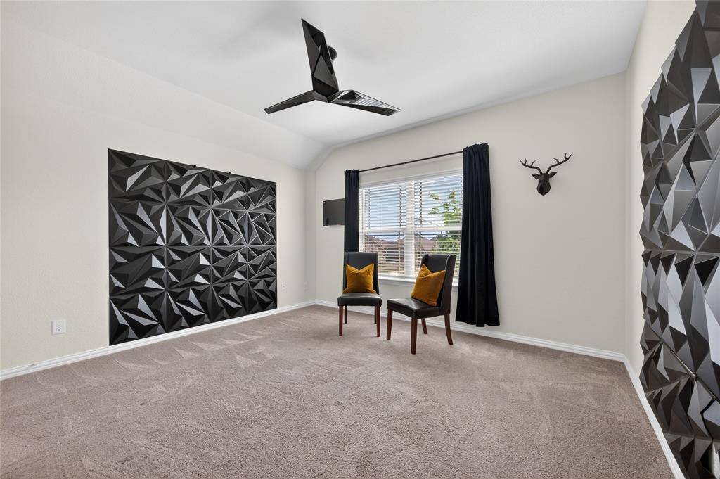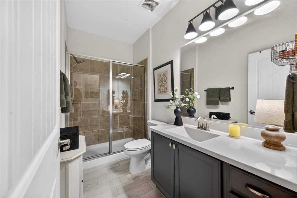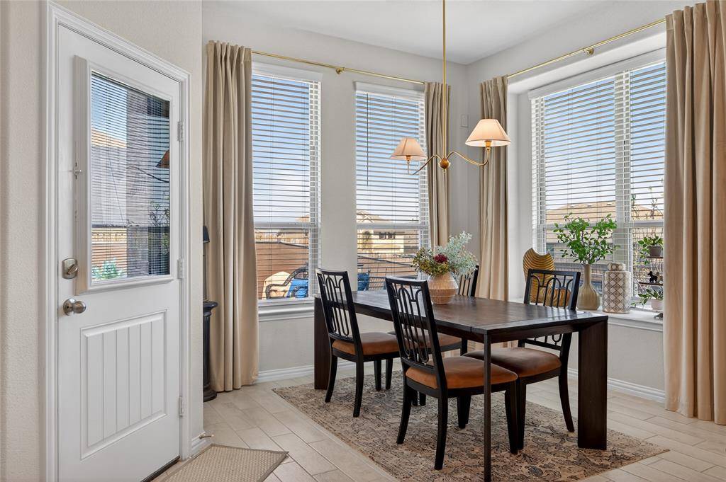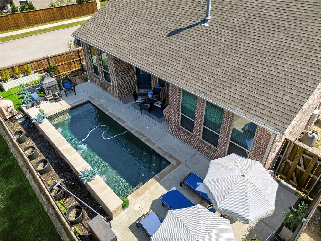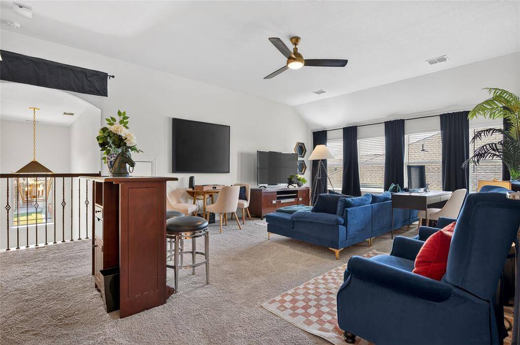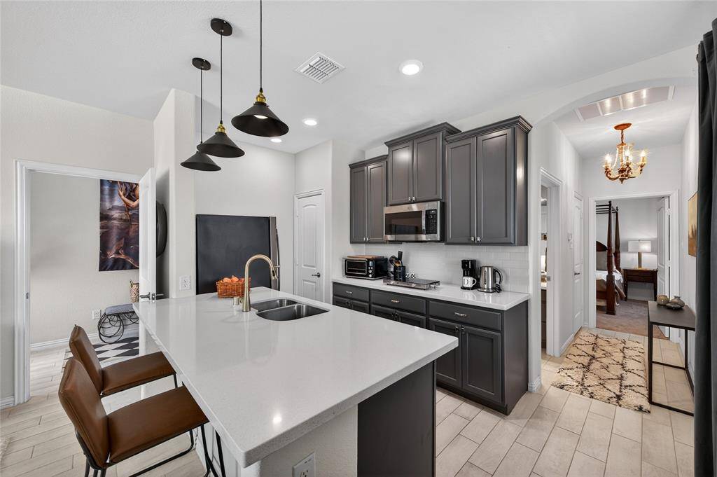 Set in Copper Crk, this 4-bedroom, 3 full bath, 1 half bath home offers 3,310 square feet with a layout designed for flexibility, everyday comfort, & polished style. A standout feature is the private first-floor 1-bedroom apartment with its own kitchen, living area, full bath, laundry closet, bedroom & walk-in closet, creating exceptional separation for long-term guests or multi-generational living. The main residence reflects the owner's professional design background, with high-end wallpaper accents, upgraded lighting, curated decor, & thoughtful finish selections that give each space a distinct identity while keeping the home cohesive. The open-concept main living area is anchored by soaring ceilings, expansive windows, a gas-log fireplace, multiple window benches, & wood-look porcelain tile, flowing into a quartz kitchen with a large island, bar seating, stainless steel appliances, dark cabinetry, designer sconces, subway tile backsplash, pantry storage, & generous prep space. The first-floor office sits behind French doors, while the primary suite offers a garden tub, separate shower, dual sinks, & a walk-in closet with custom storage. The stylish half bath with designer wallpaper, along with a dark green, dog-themed laundry room adds personality & function. Upstairs, two additional bedrooms, full bathroom & a huge game room ready for entertainment, while oversized closets throughout provide substantial storage. A decked attic adds even more storage space & could be finished out for additional square footage. Outside, the backyard oasis offers a covered patio, pool with water features, tanning area, herb garden, turf, & dog run, all within a fenced corner-lot setting with sprinkler system. HOA access includes community amenities with a pool, trails, park, & playground.