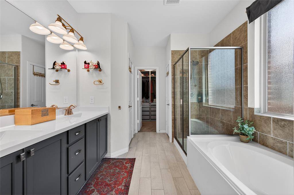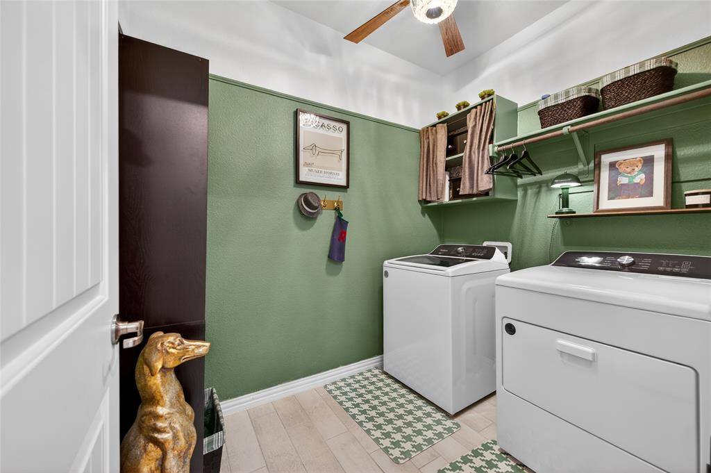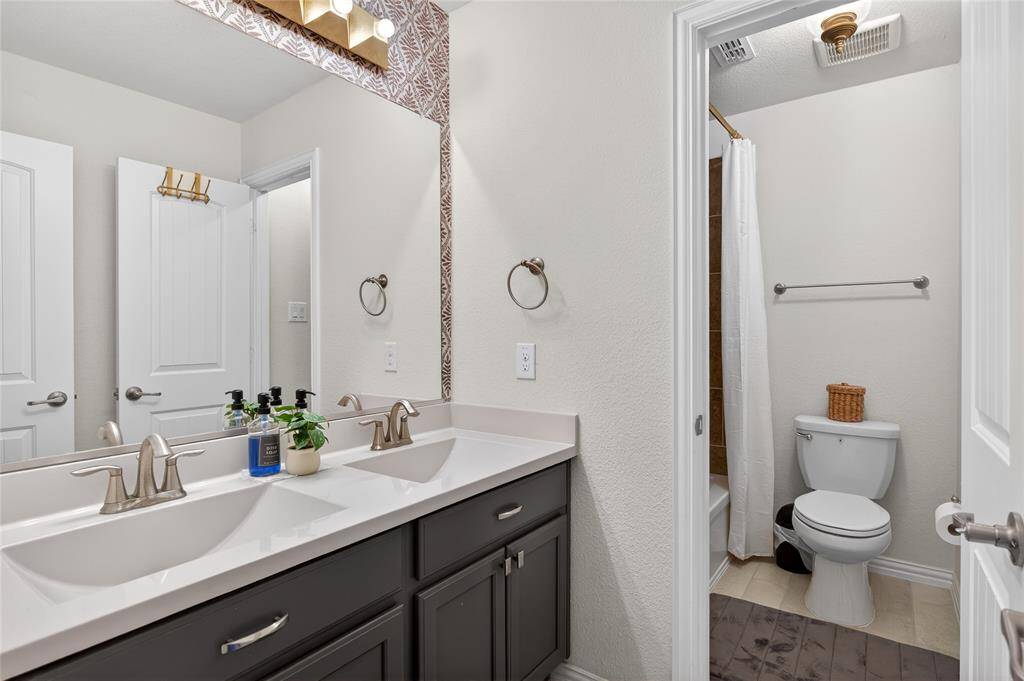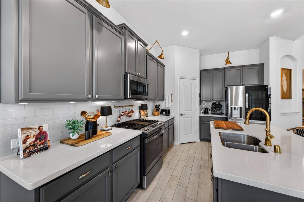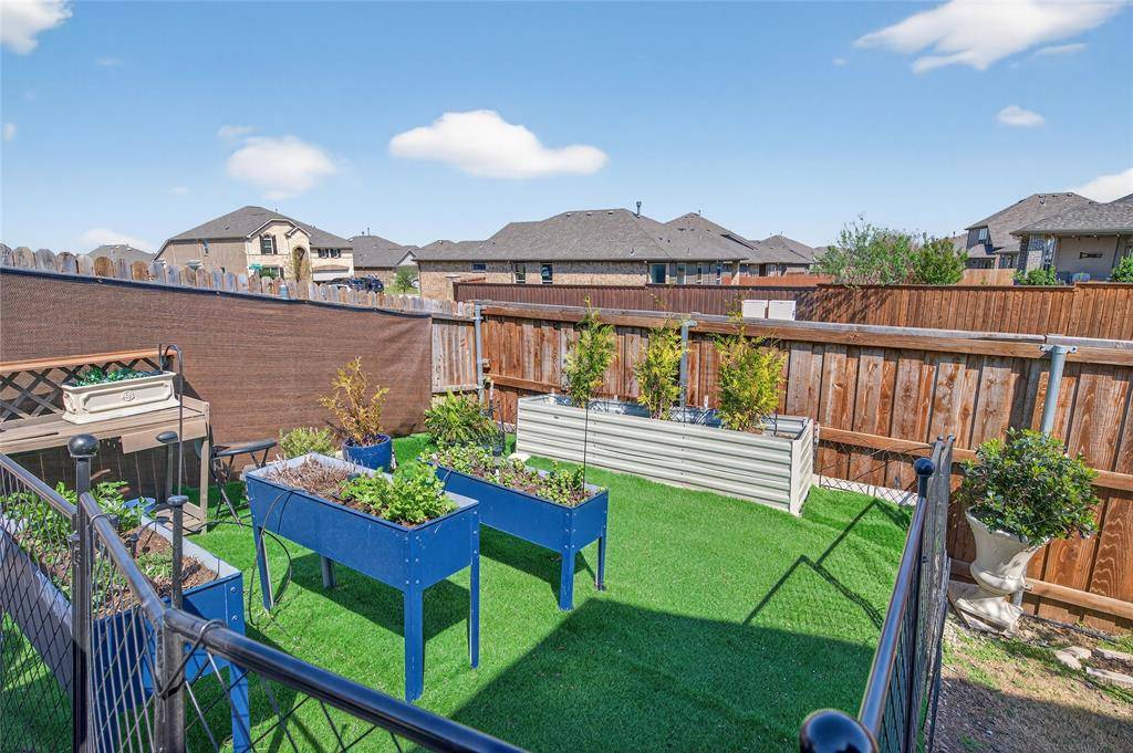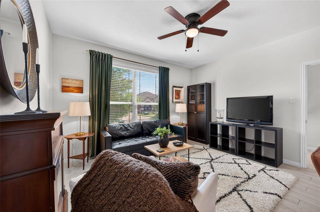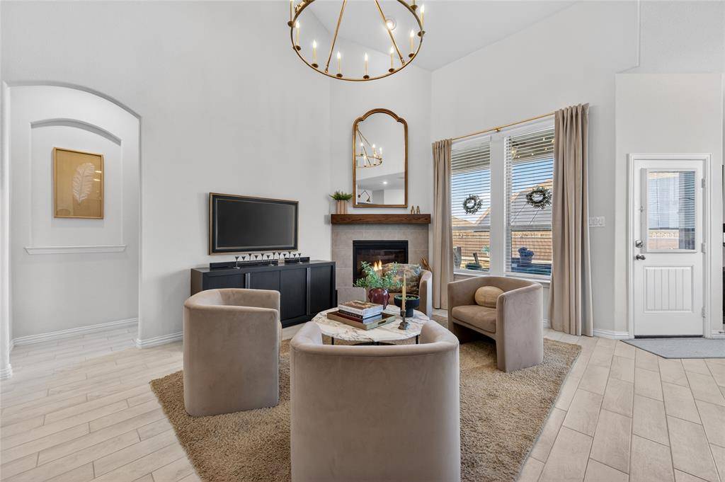 Set in Copper Crk, this 4-bedroom, 3 full bath, 1 half bath home offers 3,310 square feet with a layout designed for flexibility, everyday comfort, & polished style. A standout feature is the private first-floor 1-bedroom apartment with its own kitchen, living area, full bath, laundry closet, bedroom & walk-in closet, creating exceptional separation for long-term guests or multi-generational living. The main residence reflects the owner's professional design background, with high-end wallpaper accents, upgraded lighting, curated decor, & thoughtful finish selections that give each space a distinct identity while keeping the home cohesive. The open-concept main living area is anchored by soaring ceilings, expansive windows, a gas-log fireplace, multiple window benches, & wood-look porcelain tile, flowing into a quartz kitchen with a large island, bar seating, stainless steel appliances, dark cabinetry, designer sconces, subway tile backsplash, pantry storage, & generous prep space. The first-floor office sits behind French doors, while the primary suite offers a garden tub, separate shower, dual sinks, & a walk-in closet with custom storage. The stylish half bath with designer wallpaper, along with a dark green, dog-themed laundry room adds personality & function. Upstairs, two additional bedrooms, full bathroom & a huge game room ready for entertainment, while oversized closets throughout provide substantial storage. A decked attic adds even more storage space & could be finished out for additional square footage. Outside, the backyard oasis offers a covered patio, pool with water features, tanning area, herb garden, turf, & dog run, all within a fenced corner-lot setting with sprinkler system. HOA access includes community amenities with a pool, trails, park, & playground.
