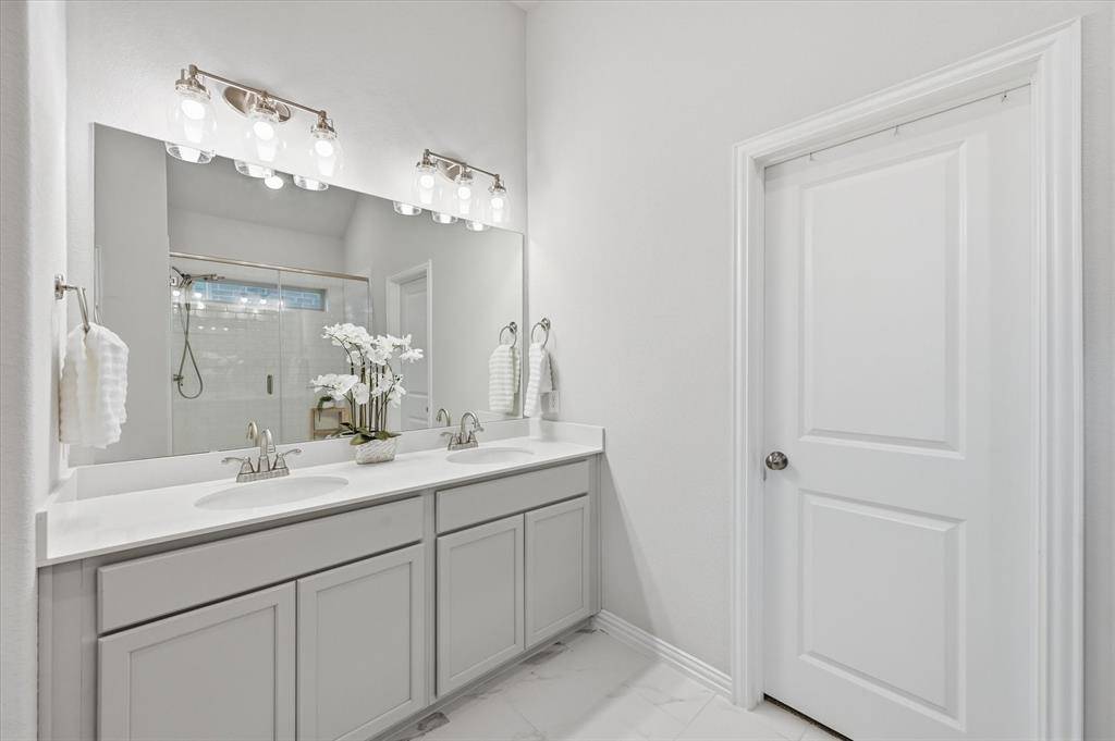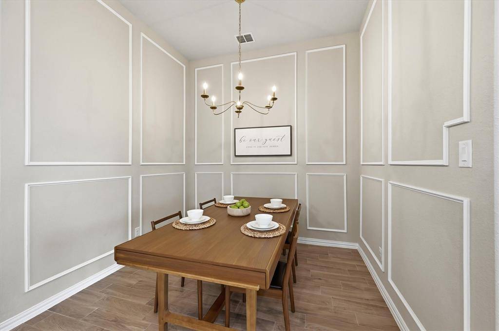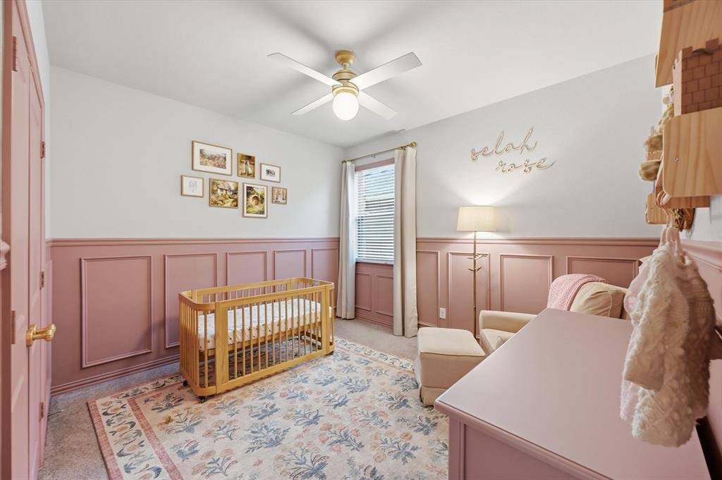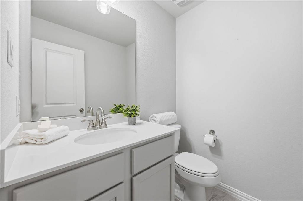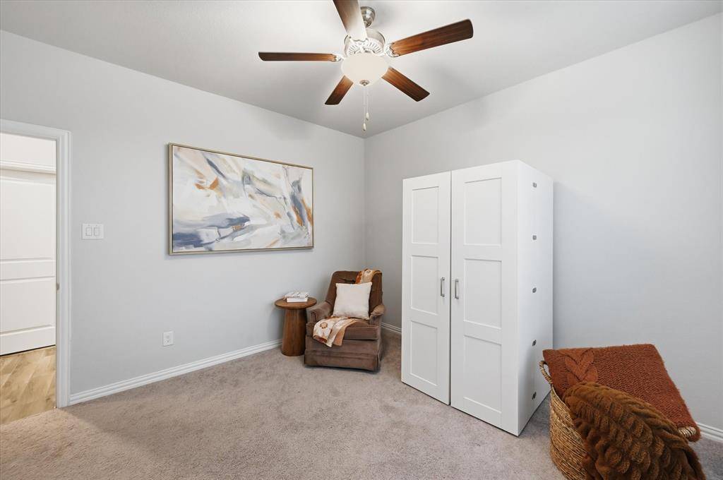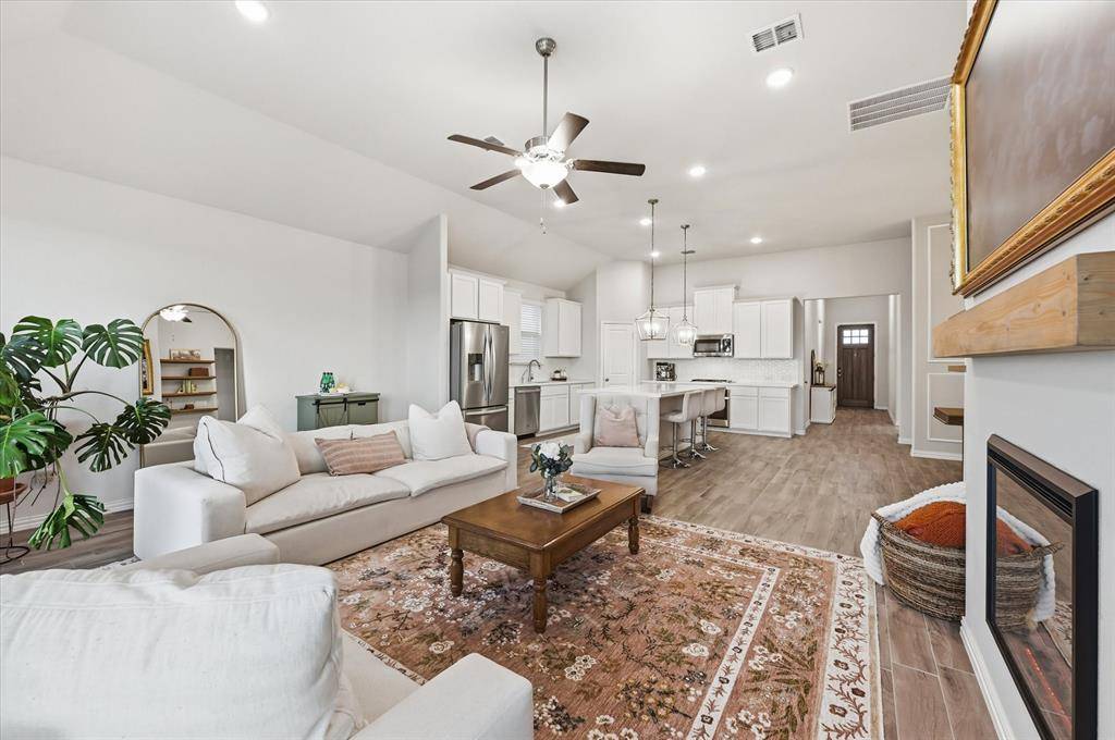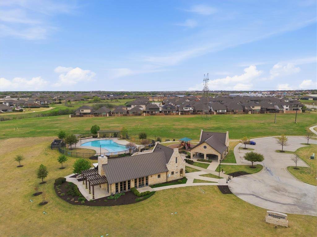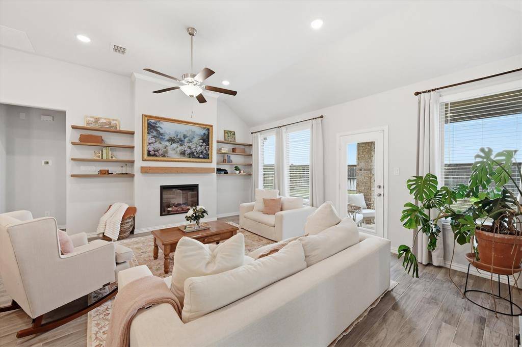 Located in highly sought-after Northwest ISD, this light and bright 4-bedroom home with a dedicated office offers both style and functionality. Situated on a quiet cul-de-sac and backing to serene green space, the home provides added privacy and a peaceful setting—all within walking distance to Berkshire Elementary School and Club House. Step inside to soaring 11-foot ceilings, wood-look tile flooring, and an open, inviting layout. The living area features built-in shelving and an electric fireplace, creating a warm and stylish focal point. The kitchen is a true centerpiece, featuring shaker-style cabinets, quartz countertops, stainless steel appliances, a gas stove, and ample prep space—ideal for both everyday living and entertaining. The spacious primary suite is a relaxing retreat, complete with bay windows, a large walk-in closet, and an en suite bath with a generously sized shower and linen closet. The office, complete with French doors and built-in shelves, offers the perfect work-from-home setup. Downstairs also includes two additional bedrooms, along with both a full bath and a convenient half bath. Upstairs, you'll find an additional living area, a bedroom with its own en suite bath, and a half bath—perfect for guests or multi-generational living. Located in an amenity-rich community, this home truly has it all—space, style, and a prime location.