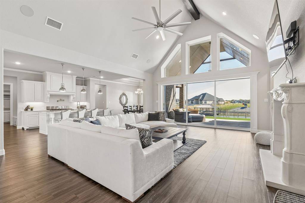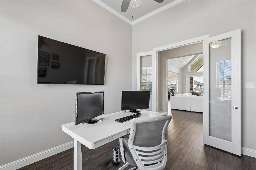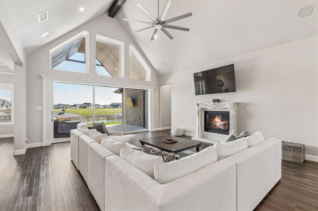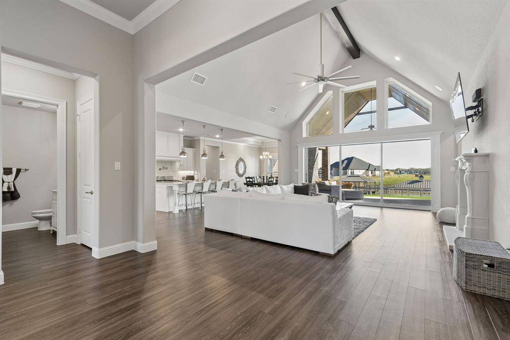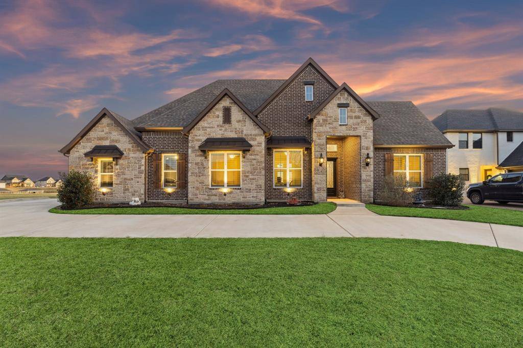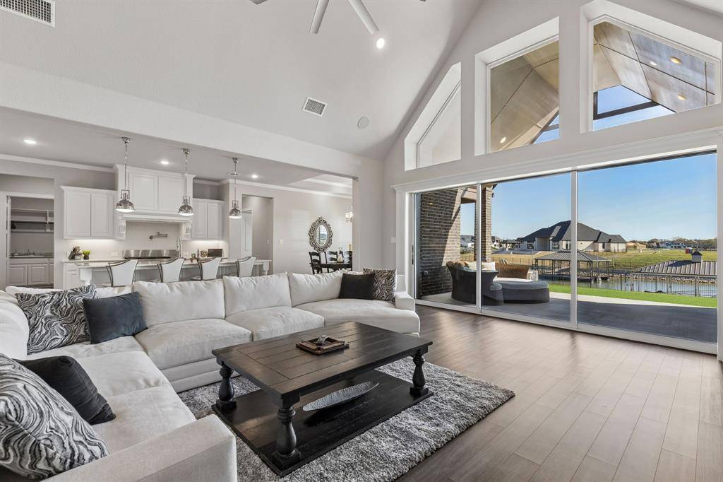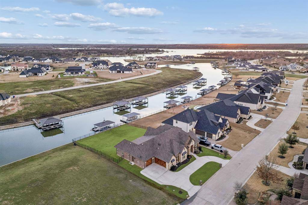 This stunning single story custom waterfront home is located in The Resort on Eagle Mountain Lake. The only 24-7 gated and guarded golf course community on Eagle Mountain Lake. Built in 2021, the home offers 4 spacious bedrooms, 4 full bathrooms, a dedicated office, and a versatile game room or flex space. The thoughtfully designed open concept layout seamlessly connects the kitchen, dining area, and living room, where sliding glass doors frame serene canal views and create effortless indoor and outdoor living. The chef's kitchen features marble stone countertops, a built in commercial grade refrigerator, gas range, walk in pantry, and custom cabinetry. The primary suite overlooks the water and offers a spa inspired en suite bath along with a walk in closet. A secondary master suite is located on the other side of the home with canal views, large en-suite bath and walk in closet. Two additional guest bedrooms are well appointed, one having an en-suite bath and the other convenient powder bath for visitors. The dedicated office, complete with French doors, overlooks both the living area and the canal, providing an inspiring work from home setting. The flex room currently being used as a gym has direct access to the patio as well. Step outside to a backyard ready for your vision, whether it's a resort style pool, extended patio, or outdoor retreat. Your private boat dock includes both a boat lift and jet ski lift, making lakeside living effortless and enjoyable year round. Notable upgrades include two tankless water heaters, a circular driveway, surround sound in the living and game rooms, and custom plantation shutters throughout. Residents of The Resort enjoy unmatched amenities, including a 19-hole golf course, clubhouse with restaurant and bar, two pools, fitness center, playground, sports courts, private beach with pergolas, boat ramp, and more. This is a rare opportunity to own a waterfront property in one of Eagle Mountain Lake's most exclusive communities.